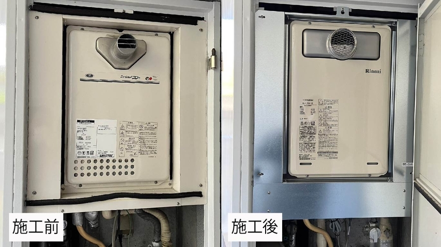 既設と同じ集合住宅のPS内に設置する排気筒が前にでているタイプを設置しました。