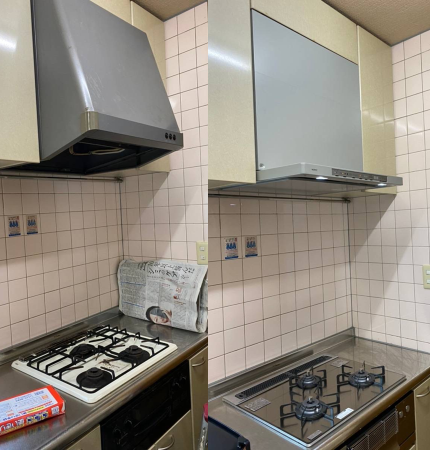 西宮市内のマンションにおけるビルトインガスコンロN3WS3PWASKSTEC・レンジフードNFG6S21MSIへの交換