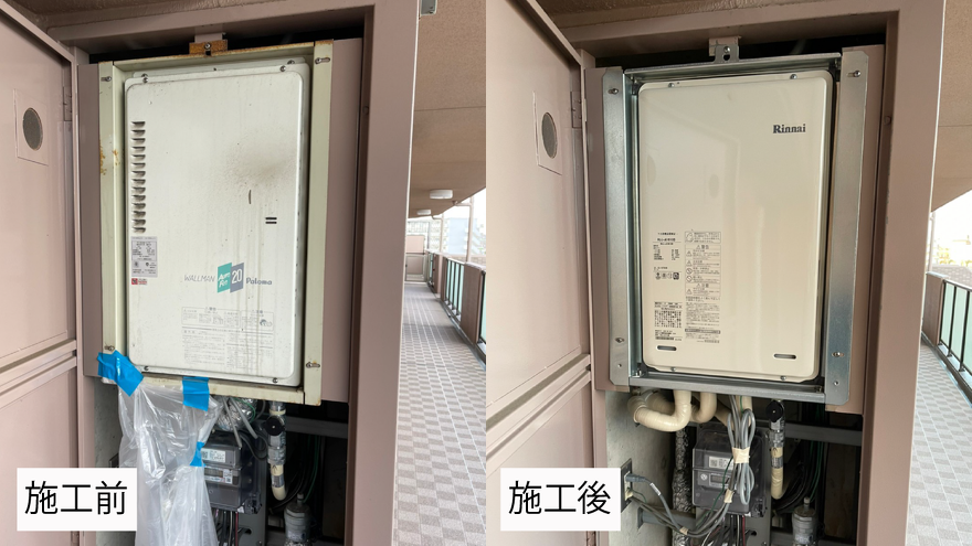 明石市内にあるマンションで高温差し湯給湯器RUJ-A1610Bへ交換