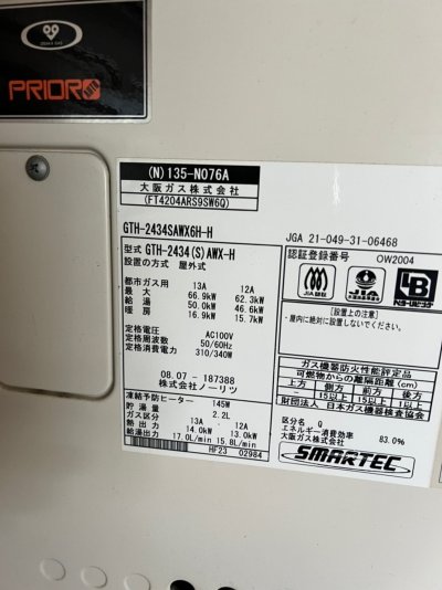 こちらの給湯器は24号タイプの追焚・暖房機能付きふろ給湯器です。