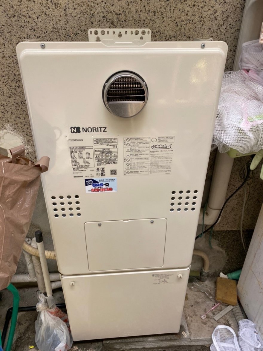ノーリツ製の屋外壁掛け設置式、フルオートタイプの追焚・暖房機能付きふろ給湯器です。