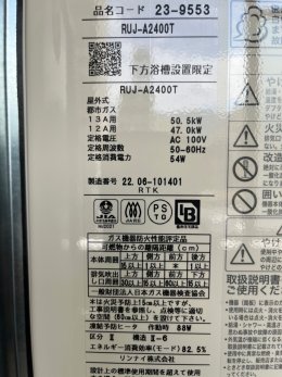 リンナイ製の24号の高温差し湯のふろ給湯器RUJ-A2400Tに