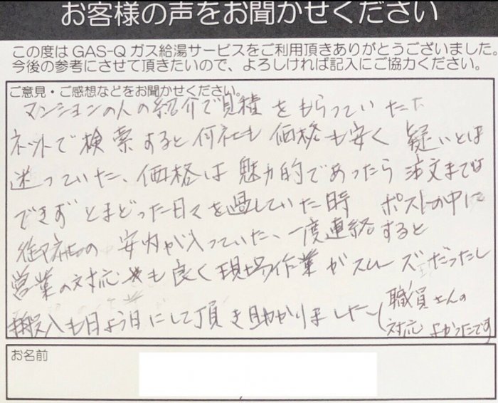 2020.12.18 お客様の声 神戸市垂水区 60代女性 この度は数ある会社の中から弊社をお選びいただき 誠にありがとうございました。 サービス内容や価格、交換工事、アフターサービス お客様に満足いただけるよう日々努めており、 お客様のご都合にあった日程最優先で 工事をさせていただいております。 お客様の期待に添うことができ、 従業員一同大変嬉しく思っております。 貴重なご意見ありがとうございました。
