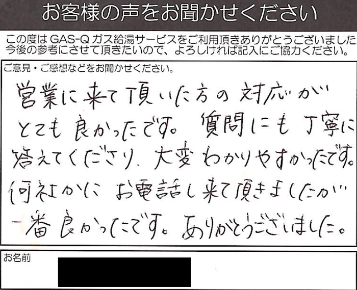 2022.09.18 お客様の声 神戸市灘区匿名様 営業に来て頂いた方の対応がとても良かったです。 質問にも丁寧に答えてくださり、大変わかりやすかったです。 何社かにお電話し来て頂きましたが一番良かったです。ありがとうございました。