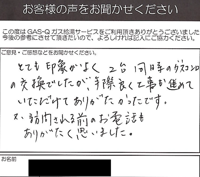 2022.09.18 お客様の声 明石市硯町匿名様 とても印象がよく2台同時のガスコンロの交換でしたが、手際良く工事を進めていただけてありがたかったです。 又、訪問される前のお電話もありがたく思いました。