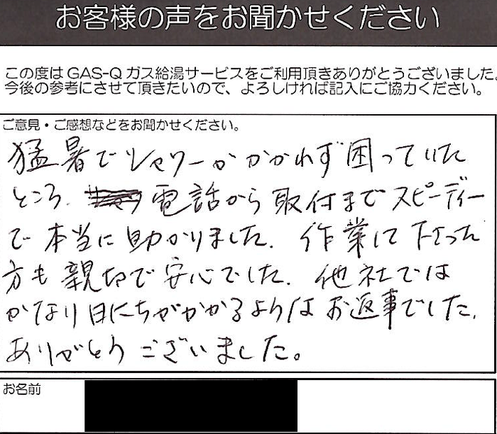 2022.09.18 お客様の声 大阪府吹田市匿名様 猛暑でシャワーがかかれず困っていたところ、電話から取付までスピーディーで本当に助かりました。 作業して下さった方も親切で安心でした。 他社ではかなり日にちがかかるようなお返事でした。ありがとうございました。