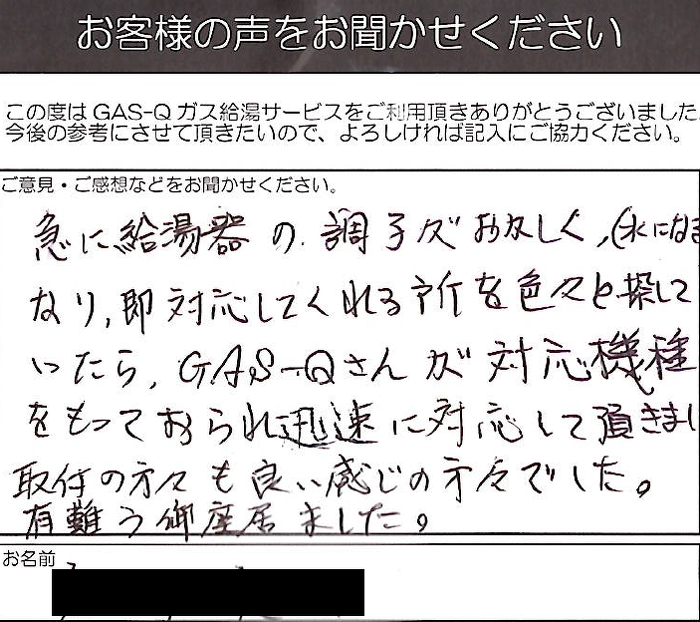 2022.09.18 お客様の声 神戸市兵庫区匿名様 急に給湯器の調子がおかしく(水になる)なり、即対応してくれる所を色々と探していたら、GAS-Qさんが対応機種をもっておられ迅速に対応して頂きました。 取付の方々も良い感じの方々でした。有難う御座いました。