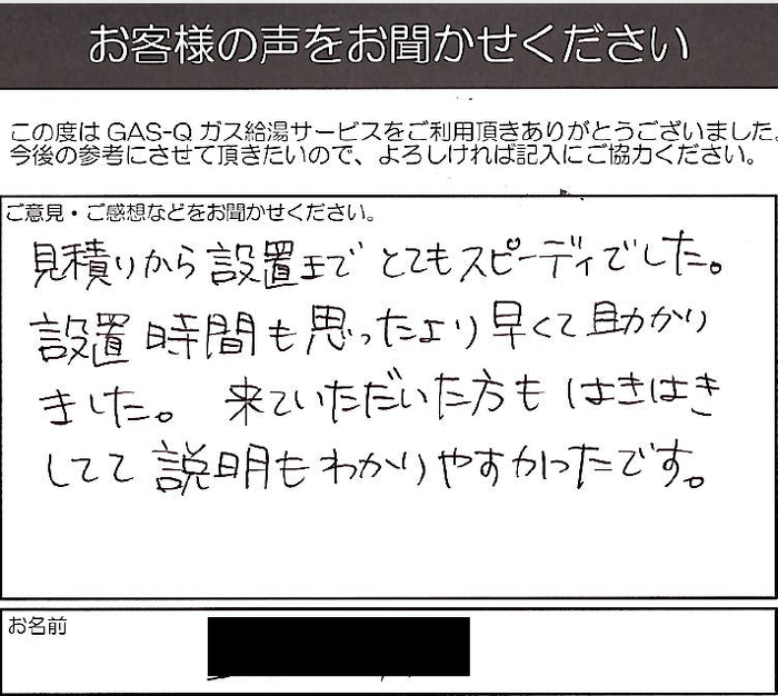 2022.09.18 お客様の声 明石市大久保町匿名様 見積もりから設置までとてもスピーディーでした。 設置時間も思ったより早くて助かりました。 来ていただいた方もはきはきしてて説明もわかりやすかったです。
