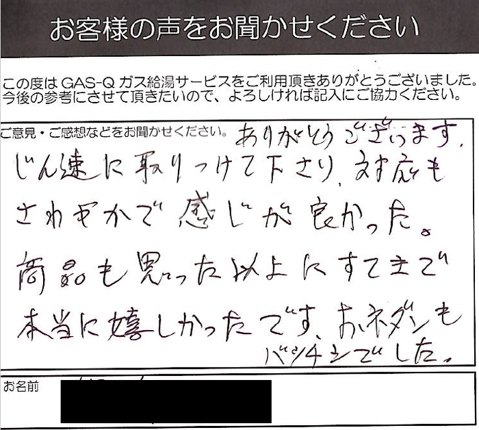 2022.09.18 お客様の声 芦屋市陽光町匿名様 ありがとうございます。じん速に取りつけて下さり、対応もさわやかで感じが良かった。 商品も思った以上にすてきで本当に嬉しかったです。おネダンもバッチシでした。