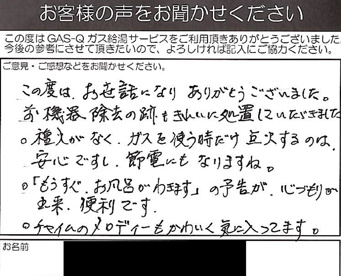 2022.09.18 お客様の声 神戸市北区匿名様 この度はお世話になりありがとうございました。 前機器除去の跡もきれいに処置していただきました。 ・種火がなく、ガスを使う時だけ点火するのは安心ですし、節電にもなりますね。 ・「もうすぐお風呂がわきます」の予告が、心づもりが出来便利です。 ・チャイムのメロディもかわいく気に入っています。