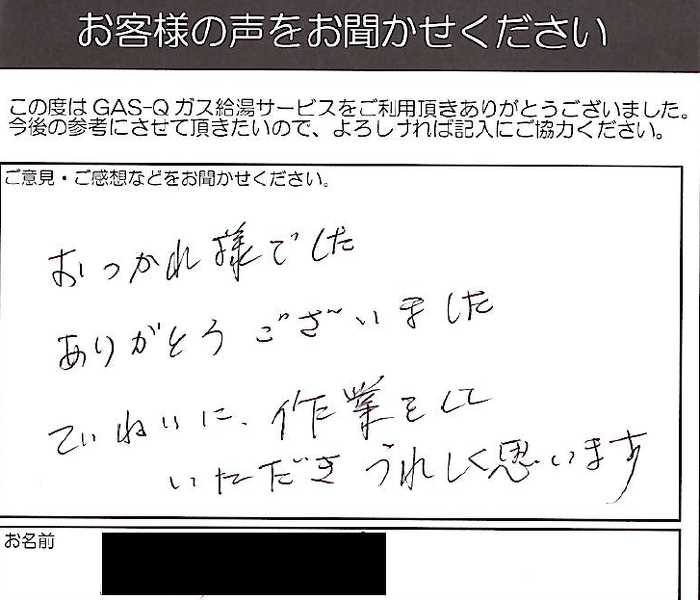 おつかれ様でした。ありがとうございました。 ていねいに作業していただきうれしく思います。