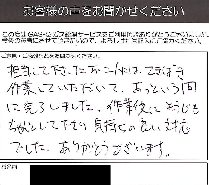 2022.09.18 お客様の声 神戸市東灘区匿名様 担当して下さったお二人にはてきぱき作業していただいて、あっという間に完了しました。 作業後にそうじもちゃんとして下さり気持ちの良い対応でした。ありがとうございます。