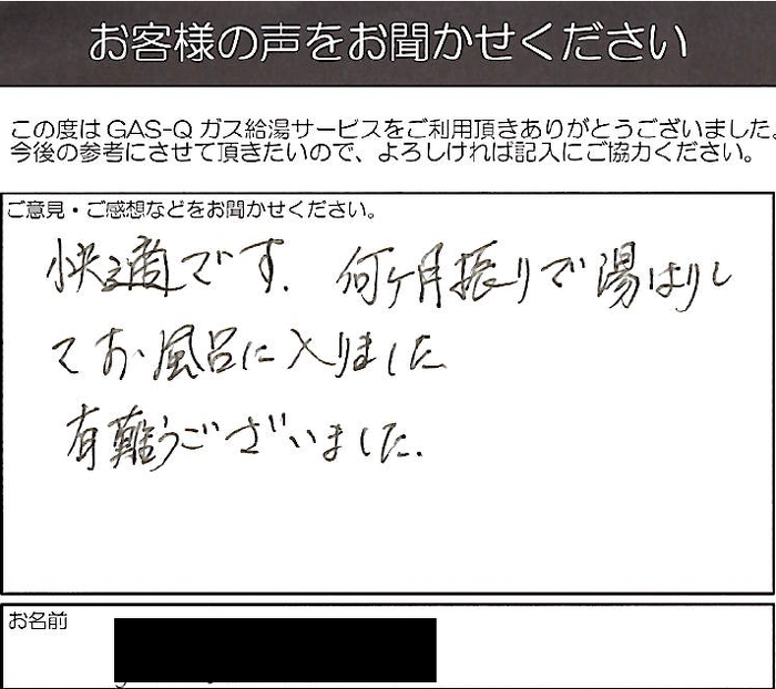 快適です。何ヶ月振りで湯はりしてお風呂に入りました。 有難うございました。