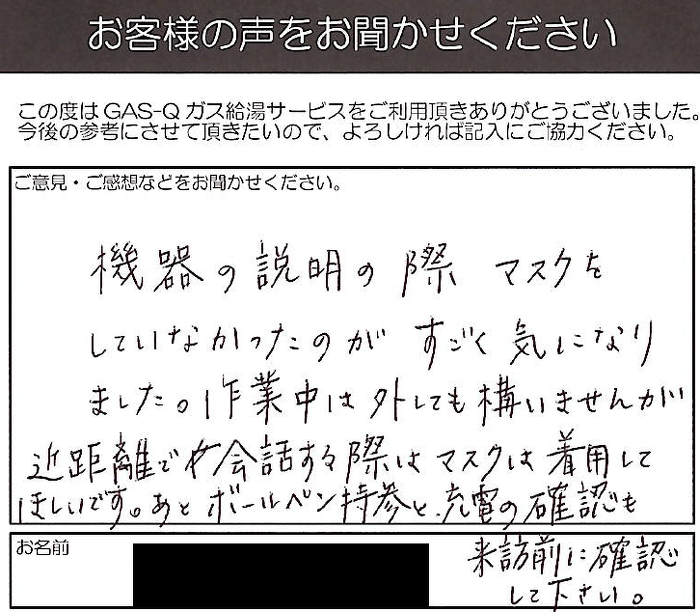 2022.11.27 お客様の声 加古川市匿名様 機器の説明の際マスクを していなかったのがすごく気になり ました。作業中は外しても構いませんが 近距離で会話する際はマスクは着用して ほしいです。あとボールペン持参と充電の確認も 来訪前に確認して下さい。