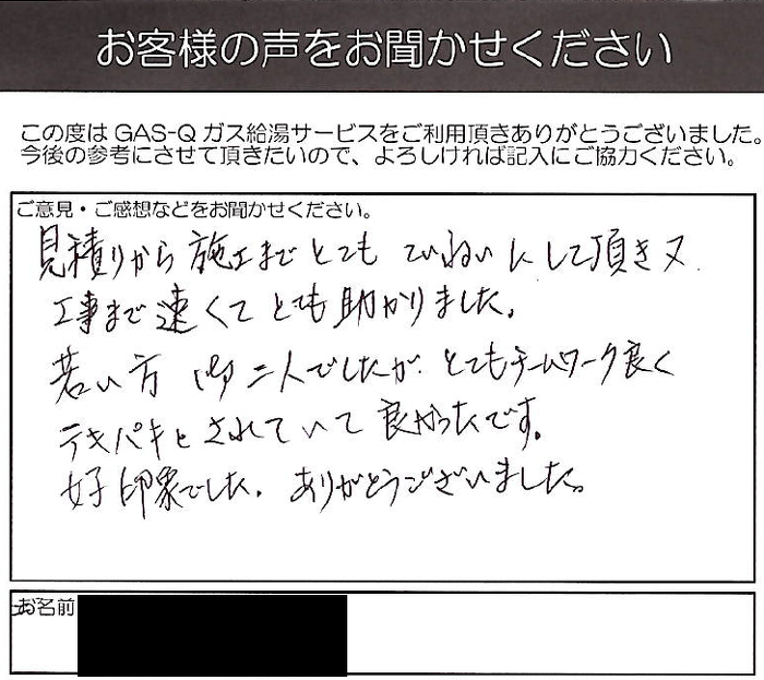 2022.12.12 お客様の声 神戸市西区匿名様 見積りから施工までとてもていねいにして頂き又 工事まで速くてとても助かりました。 若い方二人でしたが、とてもチームワーク良く テキパキとされていて良かったです。 好印象でした。ありがとうございました。