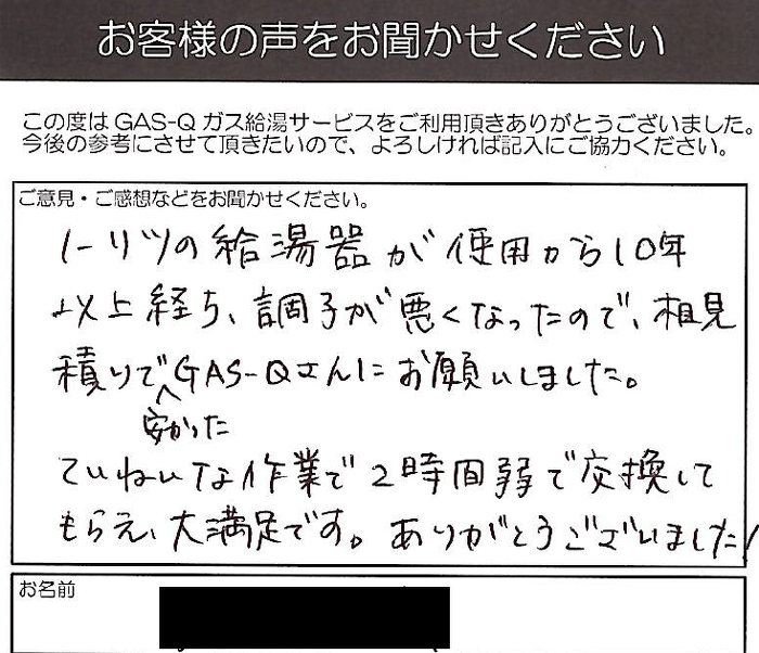 2022.12.12 お客様の声 神戸市中央区匿名様 ノーリツの給湯器が使用から10年 以上経ち、調子が悪くなったので、相見 積りで安かったGAS-Qさんにお願いしました。 ていねいな作業で2時間弱で交換して もらえ、大満足です。ありがとうございました。