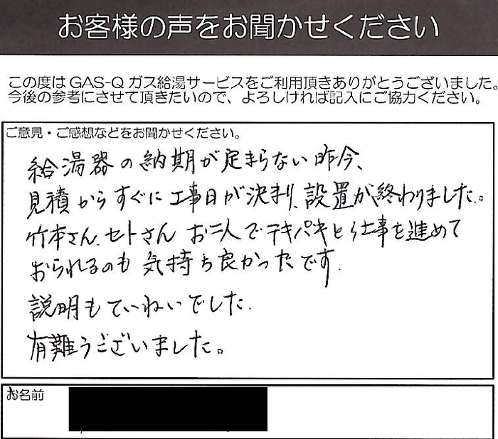 2022.12.13 お客様の声 西宮市匿名様 給湯器の納期が定まらない昨今、 見積からすぐに工事日が決まり、設置が終わりました。 竹本さん、セトさんお二人でテキパキと仕事を進めて おられるのも気持ち良かったです。 説明もていねいでした。 有難うございました。