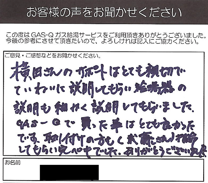 2022.12.13 お客様の声 匿名様 横田さんのサポートはとても親切で ていねいに説明してもらい給湯器の 説明も細かく説明してもらいました。 GAS-Qで買った事はとても良かった です。取り付けの方も(武藤さん)指令 してもらい完ペキでした。ありがとうございました。