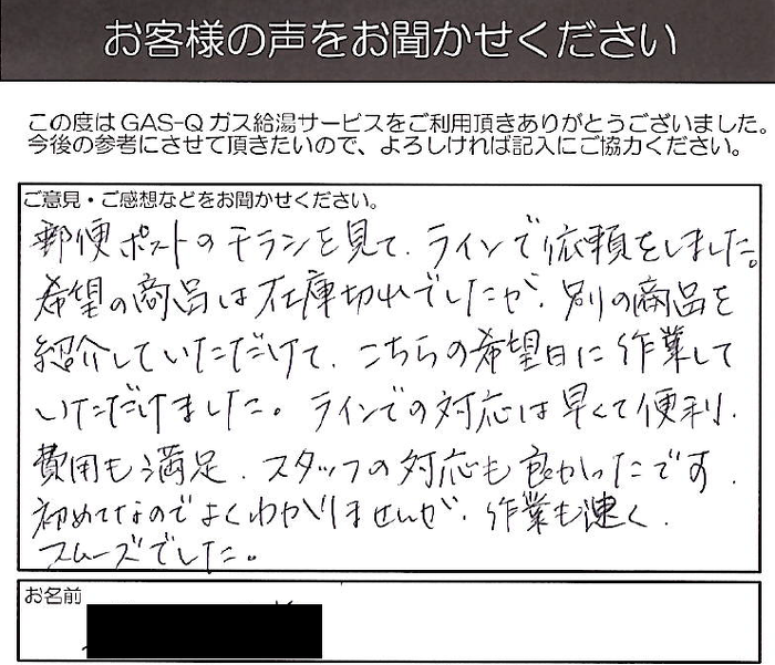 2022.12.17 お客様の声 尼崎市匿名様 郵便ポストのチラシを見て、ラインで依頼をしました。 希望の商品は在庫切れでしたが、別の商品を 紹介していただけて、こちらの希望日に作業して いただけました。ラインでの対応は早くて便利、 費用も満足、スタッフの対応も良かったです。 初めてなのでよくわかりませんが、作業も速く、 スムーズでした。