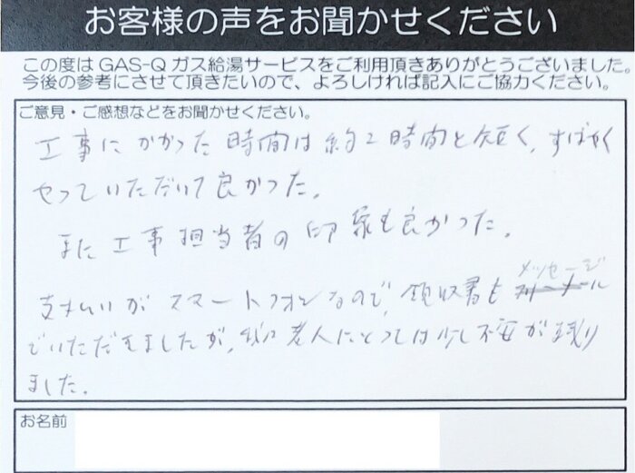 2020.12.25 お客様の声 神戸市須磨区 匿名 この度は弊社に交換工事をお任せいただき 誠にありがとうございました。 スマートフォンでのお支払いで不安が残られたこと、 誠に申し訳ございませんでした。 スマートフォンでのお支払いの場合電子領収書が主流ですが お客様がご希望の場合、 紙での領収書も発行できるようにいたしました。 ご指摘いただき誠にありがとうございます。 貴重なお時間ご意見ありがとうございました。