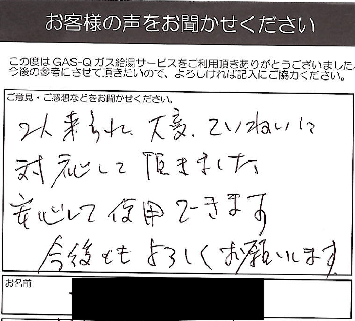 2人来られ、大変、ていねいに 対応して頂きました。 安心して使用できます。 今後ともよろしくお願いします。
