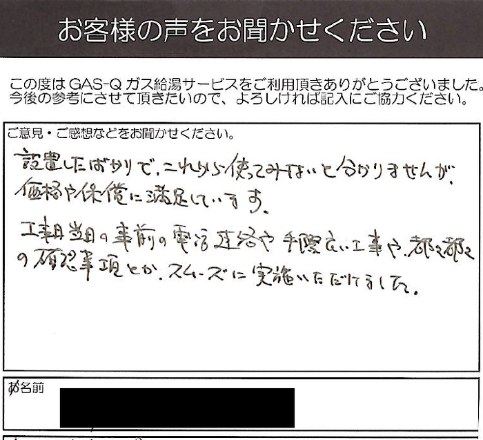 2022.12.18 お客様の声 明石市匿名様 設置したばかりで、これから使ってみないと分かりませんが 価格や保障に満足しています。 工事日当日の事前の電話連絡や手際良い工事や、都度都度 の確認事項とか、スムーズに実施いただけました。