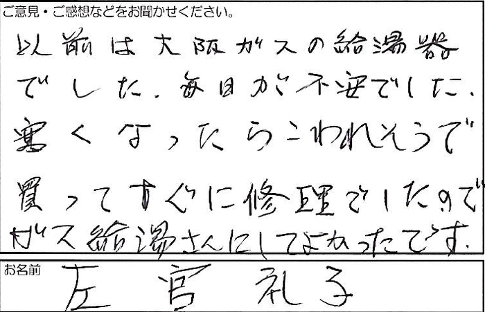 以前は大阪ガスの給湯器でした。毎日が不安でした。寒くなったらこわれそうで買ってすぐに修理でしたので、ガス給湯さんにしてよかったです。
