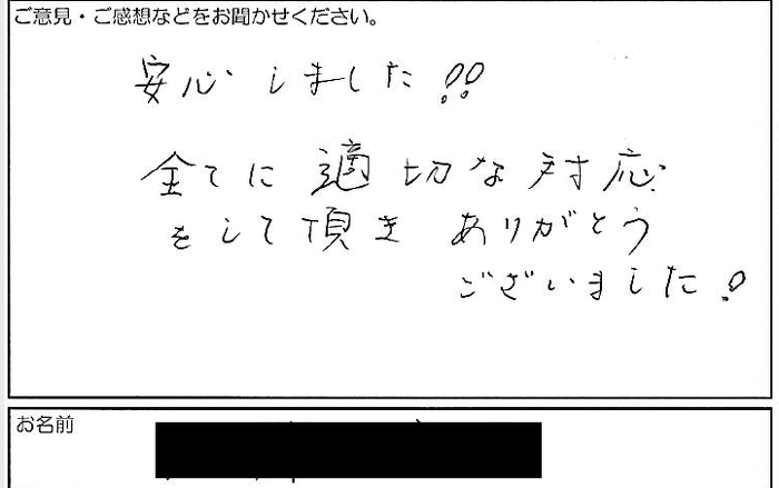 安心しました!! 全てに適切な対応をして頂きありがとうございました!
