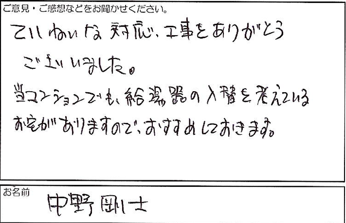 ていねいな対応・工事をありがとうございました。 当マンションでも給湯器の入替を考えられているお宅がありますので、おすすめしておきます。