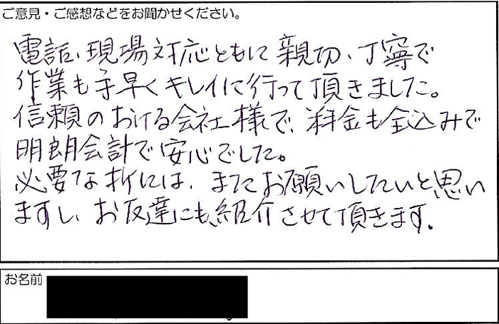 2023.02.17 お客様の声 豊中市匿名様 電話・現場対応ともに親切・丁寧で作業も早くキレイに行って頂きました。 信頼のおける会社様で、料金も全込みで明朗会計で安心でした。 必要な折には、またお願いしたいと思いますし、お友達にも紹介させて頂きます。