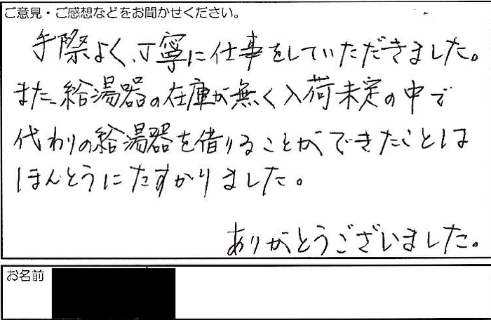 2023.02.17 お客様の声 匿名様 手際よく、丁寧に仕事をしていただきました。 また、給湯器の在庫が無く入荷未定の中で代わりの給湯器を借りることができたことはほんとうにたすかりました。 ありがとうございました。