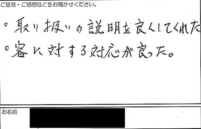 ・取り扱いの説明を良くしてくれた ・客に対する対応が良かった。