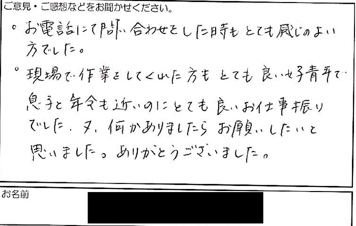 2023.02.17 お客様の声 神戸市匿名様 ・お電話にて問い合わせをした時もとても感じのよい方でした。 ・現場で作業してくれた方もとても良い好青年で、息子と年令も近いのにとても良いお仕事振りでした。又、何かありましたらお願いしたいと思いました。ありがとうございました。