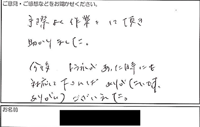 手際よく作業をして頂き助かりました。 今後、トラブルがあった時にも対応して下さればありがたいです。 ありがとうございました。