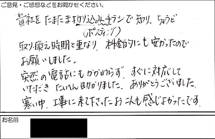 2023.02.17 お客様の声 茨木市匿名様 貴社をたまたま折り込み(ポスティング)チラシで知り、ちょうど取り換え機関と重なり、料金的にも安かったのでお願いしました。 突然の電話にもかかわらず、すぐに対応していただきたいへん助かりました。ありがとうございました。 寒い中、工事に来て下さったお二人も感じよかったです。