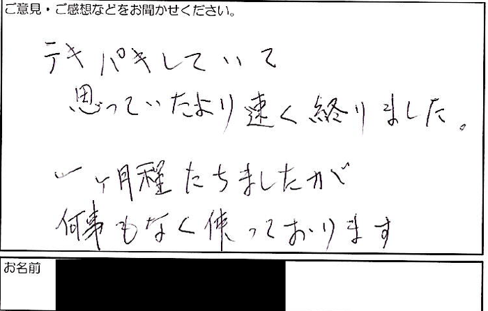 テキパキしていて思っていたより早く終わりました。 一ヶ月程たちましたが何事もなく使っております。