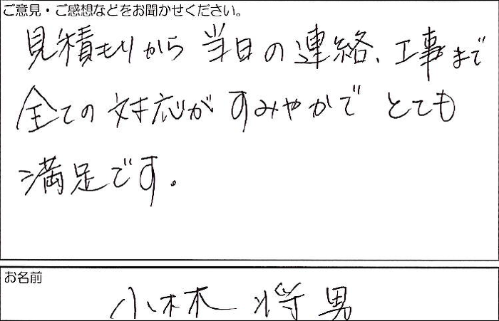 見積りから当日の連絡、工事まで全ての対応がすみやかでとても満足です。