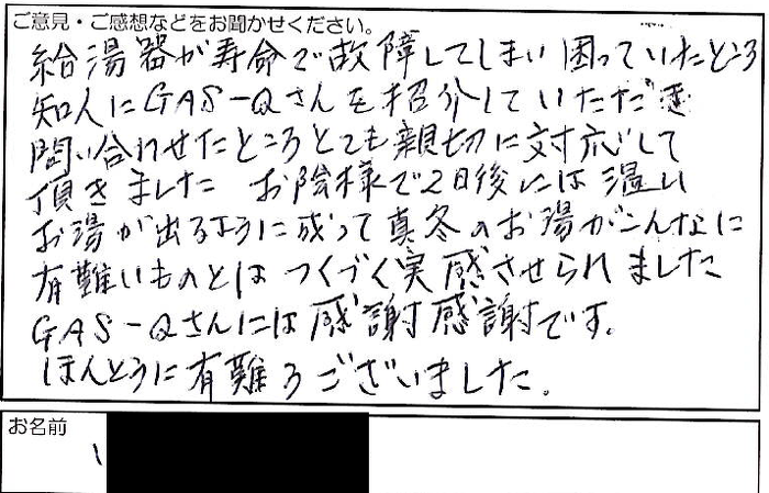 2023.02.17 お客様の声 神戸市匿名様 給湯器が寿命で故障してしまい困っていたところ、知人にGAS-Qさんを紹介していただき問い合わせたところとても親切に対応して頂きました。お陰様で2日後には温かいお湯が出るように成って真冬のお湯がこんなに有難いものとはつくづく実感させられました。GAS-Qさんには感謝感謝です。 ほんとうに有難うございました。