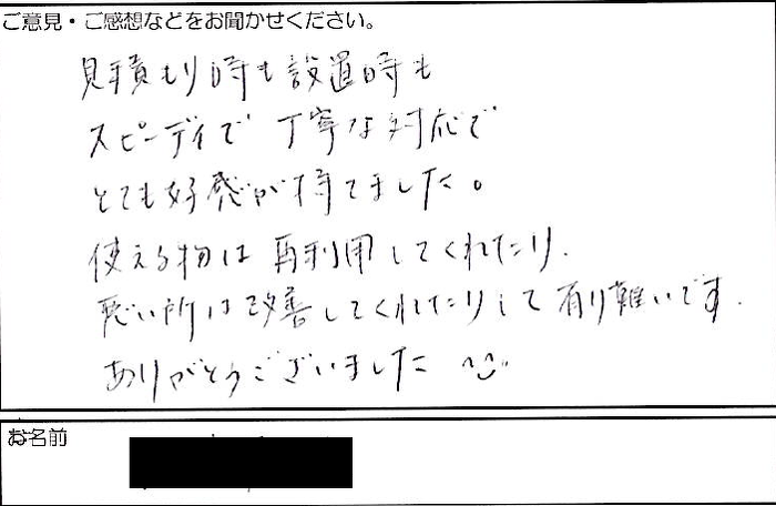 2023.02.17 お客様の声 神戸市匿名様 見積もり時も設置時もスピーディーで丁寧な対応で、とても好感が持てました。 使えるものは再利用してくれたり、悪い所は改善してくれたりして有難いです。 ありがとうございました。