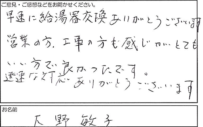 早急に給湯器好感ありがとうございます。 営業の方、工事の方も感じがとてもいい方で良かったです。 迅速な対応ありがとうございます。