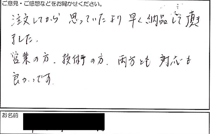 注文してから思っていたよりも早く納品して頂きました。 営業の方、技術の方、両方とも対応良かったです。