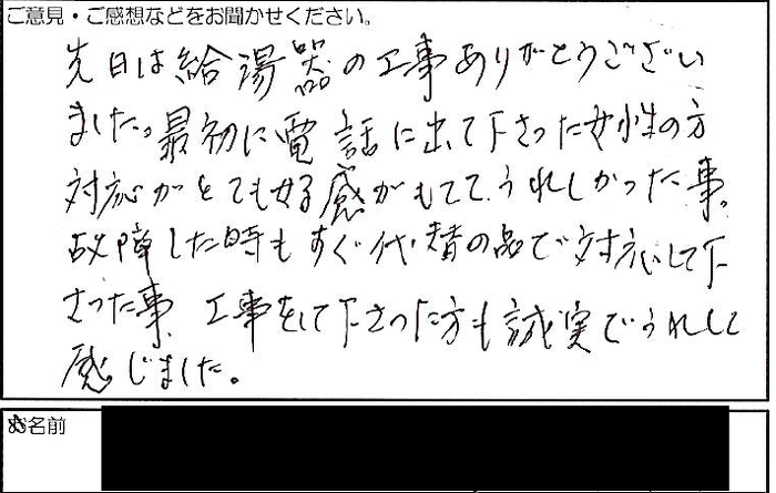 2023.02.17 お客様の声 西宮市匿名様 先日は給湯器の工事ありがとうございました。最初に電話に出て下さった女性の方の対応がとても好感がもててうれしかった事。 故障した時もすぐ代替の品で対応して下さった事、工事をして下さった方も誠実でうれしく感じました。