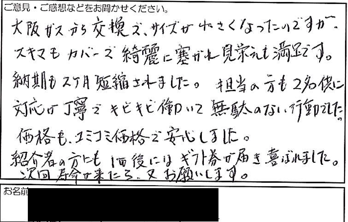 2023.02.17 お客様の声 宝塚市匿名様 大阪ガスから交換でサイズが小さくなったのですが、スキマもカバーで綺麗に塞がれ見栄えも満足です。納期も2ヶ月短縮されました。担当の方も2名共に対応が丁寧で、キビキビ働いて無駄のない行動でした。 価格にコミコミ価格で安心しました。 紹介者の方にもギフト券が届き喜ばれました。 次回寿命が来たら、又お願いします。