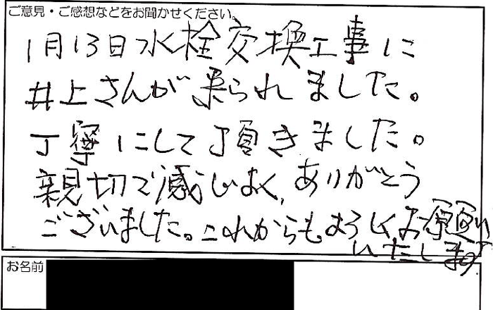 1月13日水栓交換工事に井上さんが来られました。丁寧にして頂きました。 親切で感じがよく、ありがとうございました。これからもよろしくお願いいたします。