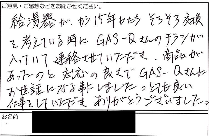 2023.02.17 お客様の声 吹田市匿名様 給湯器がもう15年もたち、そろそろ交換を考えている時にGAS-Qさんのチラシが入っていて連絡させていただき、商品があったのと対応の良さでGAS-Qさんにお世話になる事にしました。とても良い仕事をしていただきありがとうございました。