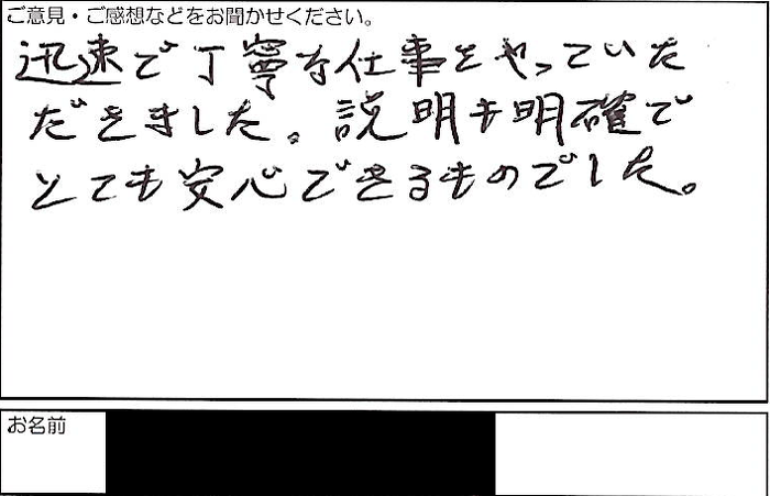 迅速で丁寧な仕事をやっていただきました。説明も明確でとても安心できるものでした。