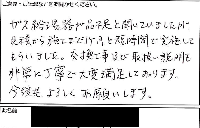2023.02.17 お客様の声 神戸市匿名様 ガス給湯器が品不足と聞いていましたが、見積りから施工まで1ヶ月と短時間で実施してもらいました。交換工事及び取扱説明も非常に丁寧で大変満足しております。今後共、よろしくお願いします。