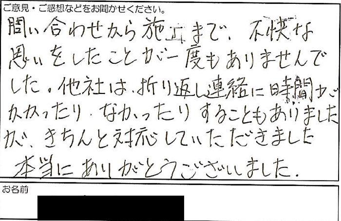 2023.02.17 お客様の声 大阪市匿名様 問い合わせから施工まで、不快な思いをしたことが一度もありませんでした。他社は、折り返し連絡に時間がかかったりなかったりすることもありましたが、きちんと対応していただきました。 本当にありがとうございました。