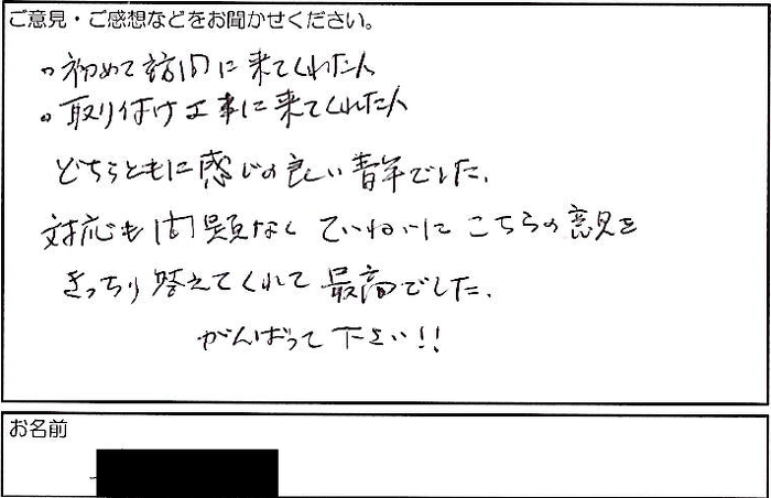 2023.02.17 お客様の声 明石市匿名様 ・初めて訪問に来てくれた人 ・取付け工事に来てくれた人 どちらともに感じの良い青年でした。 対応も問題なくていねいにこちらの意見をきっちり答えてくれて最高でした。 がんばって下さい!!