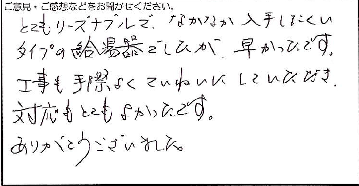 2023.04.02 お客様の声 神戸市匿名様 とてもリーズナブルでなかなか入手しにくいタイプの給湯器でしたが、早かったです。 工事も手際よくていねいにしていただき、対応もとてもよかったです。 ありがとうございました。